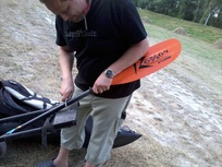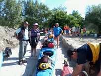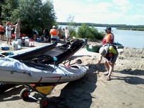 Tänään vesillelaskussa onnistuttiin repäisemään pakkiksen kärrystä akseli irti,luulot pois heti aamusta! No,paketoimme kärryn kannelle korjataksemme sen päivän ruokatauolla, Jorman mukaan vain paikalleen ja holkin kiristys joka toimikin. Taivas on auki joten tulee lämpimät 51 km. Onneksi maisemat ovat hieman paremmat kuin eilen mutta pitkiä suoria riittää. Ruokatauolla vaihdoimme Arvin kanssa paikkoja. Zoska tosiaan tuntuu miltä näyttääkin ja Pakkis näyttää miltä tuntuikin :-) Maihinnousupaikka oli erinomaisen jyrkkäreunainen mutta siihen oli rakennettu kiskot ja kelkka jolla paatit nousivat miesvoimin parinkymmenen metrin matkan, mitenkähän huomenaamulla alaspäin..? Leirin pystytyksen jälkeen lepoa ja ruoka, jota jonottaessa paikalle tuli tv-kuvausryhmä ja heti perään infotilaisuus. Ruoan jälkeen lähdimme kultur-tourille bussilla. Viiden minuutin ajomatkan päätteeksi löysimme itsemme maatalousnäyttelystä! Lavalla oli jos jonkunlaista rivitanssia... Näköjään järjestäjämmekin oli ihmeissään kultur-tourin annista mutta tällä mennään. Lahjoitimme yhden tipusen tuttavamme pojalle joka oli auttanut meitä ja muita ylösnousussa, koko päivän urakasta hän sai järjestäjiltä vihreän TID- paidan joita jakavat päivän auttavaisimmalle henkilölle :-)