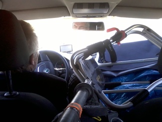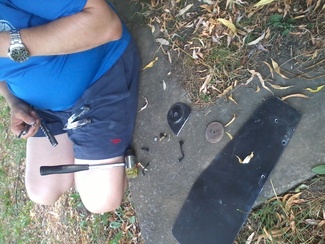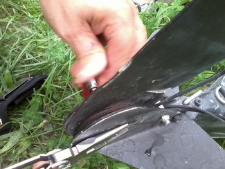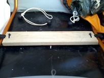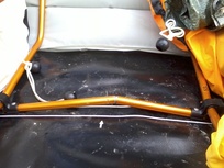 Takaisin leiriin ihmettelemään kalusto-ongelmia, pakkiksen purettuamme näimme että kölirima oli puristuksessa pullahtanut keskikohdasta ylös ja hypännyt paikaltaan. Vedin sen takaisin ja painoin jalalla rimanpäitä alas. Lisävahvistukseksi löysimme laudanpätkän tien varrella olevasta peräkärrystä. Siitä nykertämään vahvikepalaa, jonka onnistumisen koemme huomenna.