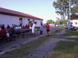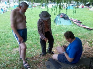 Loppusuoralla näimmekin jo Dunaujvaroksen terästehtaiden piiput ja sitten yhden pohjapadon virtauksissa ja pyörteissä laskun jälkeen huomasin että Zoskan peräsin on taas taittunut. Ja suoristaessani näin että se oli taitekohdasta lähes poikki. Muu ei auta kuin tämä huomioiden maihinnousupaikalle asti joka oli laiturille, kanto jyrkkää ramppia ja parit vielä jyrkemmät portaat ylös ennen pientä kärryttelyä. Leiri pystyyn ja peräsintä korjaamaan, päädyimme tekemään uudet reiät ehjään osaan joten lapa vain lyheni hieman. Korjaus onnistui hyvin joten aloimme odottaa päivällistä, täällä ei ole mitään virvokemyyntiä joten lepäilimme törkeän kuumissa teltoissamme, ulkona nurmikko on tulvan jäljiltä mutapölyssä ja lisäksi myyrien möyrimä. Päivällisellä luovutimme yhden tipusen paikalliselle järjestäjälle ja saimme esitteitä ja pullon punaista. Illemmalla kävimme vielä kävelyllä paikalliseen liiteriin josta täydensimme ruokavarastojamme.