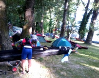 Nousemme tulvavallin päälle jossa on kapea puisto ja leirimme. Teltat pystyyn, paatit purkuun. Sen päälle korkkaamme Dunaujvaroksesta saamamme punkun ja katselemme jokimaisemaa.