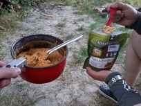 Päivälle osui pari voimalaitoksen ohitusta maitse, kevensin kuormaa aina ettei pakkis käsiin leviä. Ekassa ohituksessa kävin kuvaamassa isoa kanoottipujottelurataa, joka oli enempää käyttöä vaille, harmi, kunpa Suomessa olisi moinen niin... Toisen ohituksessa söimme ja lähtiessä sitten taas rutisi! Jormalla meni mela poikki vesille lähdössä, no ei muuta kuin varamela käyttöön ja menoksi. Yöpaikalle tuloohdassa oli kova virta ja sisäänheittäjät ja arvatkaa saiko pakkis taas kovaa kättä! 'It's bending don't lift!!' hohhoijjakkaa. Noh, leiri pystyyn ja lippua vastaan ruokaa paikallisesta tavernasta, joka olikin kuin ajassa taaksepäin. Vessan huuhtelukin toimi 'ota-sanko-ja-kaada-vettä-pyttyyn' automaatiolla, siis jos sangoissa oli vettä. Mutta mukava fiilis ja musiikkia, paistettuja kaloja ja juomapuolta varsin kohtuulliseen hintaan.