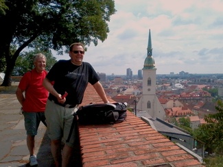 Yöllä alkoi sadella kuuroittain ja aamullakin tuli harvakseltaan vettä mutta ilma oli niin lämmin että pakattiin kevyet sadetakit vain mukaan ja lähdettiin kaupungille etsimään aamiaista. Sitähän sitten etsittiin, lopulta vanhankaupungin torin laidalta jotain leipähässäköitä saimme eteemme. Sitten noustiin vuorelle jossa oli jykevä linnoitus ja hulppeat näköalat ympäri Bratislavaa... Ja turisteja. Sieltä laskeuduttiin St. Martin katedraalille jossa jotain messua, korkeuksissa aarrekammio ja syvyyksissä kuolemanhiljaiset katakombit. Sieltä syömään, Jorma johdatti meidät Tizlava-ravintolaan jossa vedettiin makkaraa. Muttei mitään hookoon blöötä... Asemuseokin tsekattiin ja jossain välissä etsittiin Arville rakkolaastaria ja uudet sandaalit, vanhat lensivät vinhasti roskiin! Leiriin palattuamme akkujen latausta, pyykkiä ja kamojen järjestelyä huomista varten. Tulee pari sulkua jotka tulevat olemaan jänniä. Mutta millä lailla, nähdään huomenna!