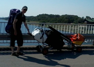 Lopulta onnistumme, ja kanoottikärryt saavat päälleen pelottavat kuormat. Jo rantaan kuljetuksessa akselit kuumenivat niin että pelkäsimme muovisten pyörännapojen sulavan kelvottomiksi. Ratkaisimme laittamalla aurinkorasvaa liukasteeksi, ja toimi. Vesillä homma toimi mahtavasti, Tonava ja proomut kuuluvat yhteen! Virta kyllä vei todella kovaa ja monen sadan metrin levyinen uoma kun oli niin vesi menee kohtuu tasaisena pintana ettei vauhtia huomaa ennen kuin katsoo rantaa joka vilisee ohi!
