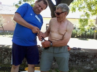 Pääsimme ajoissa vesille, noin 7.15. Hellepäivä Suomen mittapuulla ja 38 km edessä. Alku meni taas Budapestin läpi joten katseltavaa riitti kahden tunnin ajaksi. Sitten alkoikin tylsät lakeudet. Loppusuoralla alkoi Szazhalombattan öljyjalostamon liekit ja savut piipuista värittää taivaanrantaa, aika karu saapuminen mutta maihinnousu oli perfekt! Toimiva laituri/luiska-kokonaisuus ja lyhyt kärräysmatka. Leiri pystyyn ja etsimään kauppaa parin kilsan päästä, Tesco oli kunnon supermarket josta löytyi muitakin. Matkalla menimme omakotialueen läpi ja lähes joka pihalla oli koira tai kaksi, isoin koira mikä nähtiin (Puli) makasi puun alla ja haukahteli kyljellään! Kadun varren puista sai valita syökö kirsikkaa vai luumua :-) Takaisin tultuamme pieni tauko ja syömään, yllätys oli suuri kun meidät ohjattiin isoon saliin katettuihin pöytiin ja tavallisen gulassin sijasta saatiin pari paneroitua piffiä höysteineen. Tulossa vielä allekirjoittaneen synttärikaffet ja marketista löydetty 'Erkin pikakivääri' joka on minulle uusi tuttavuus =-O