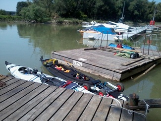 Herättiin kello viisi aamukasteiseen oloon, leiriä kokoon ja puskapartiointia kun tää nyt on tätä. Ainakin itikat tykkäävät kun saavat tulvan huuhtomaan savipusikkoon puolustuskyvyttömän melojan. Päästiin vesille puoli kasilta. Seitsemän kilsaa vanhan Tonavan uomaa hittaasti virtaavaa, sitten pääuomaa piiitkä siivu ja vauhdilla ja lopuksi kolme kilsaa vastaista(!) pitkin Vah-jokea. Leiri pystyyn ja lippuruokailuun, mitähän nyt tulee... Nousimme tulvavallin päälle ja voilá! Komea melontakeskus! Söimme, pesimme vaatteet ja itsemme, latasimme akut ja elävää haitarimusiikkia paikallisten nuorten toimesta, alles gut! Oikein hyvä lopetus reissun pisimmälle päivälle, 56 km. Huomenna lähes saman mittainen joten.... Zzzzzz.....