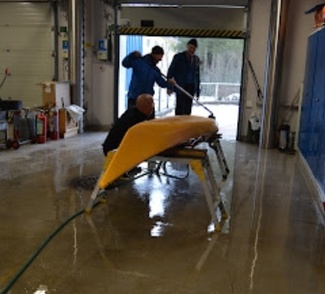 ![]() Ennen altaaseen siirtymistä kajakit pestään ja desinfioidaan. |